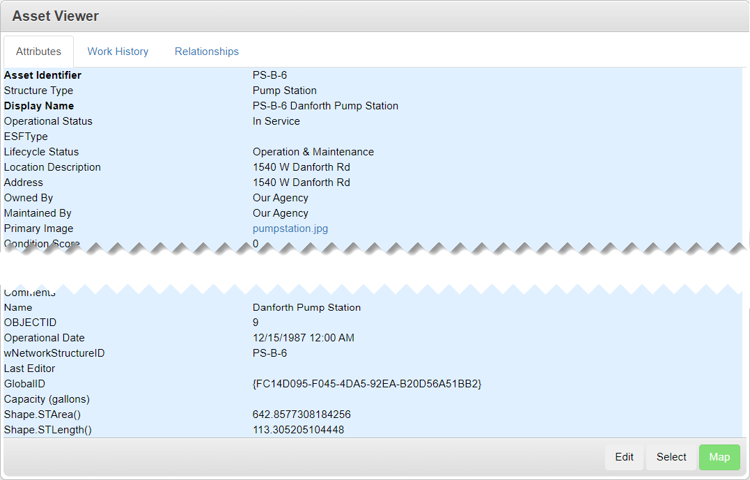 Asset Viewer allows you to view and edit attribute information, as well as view work history and relationships.