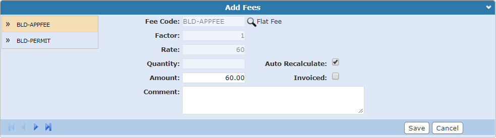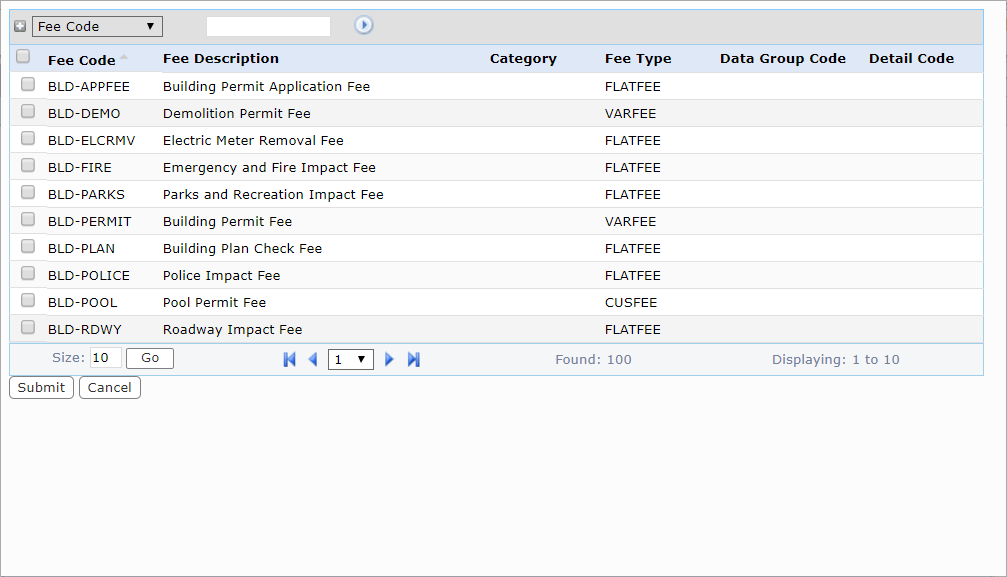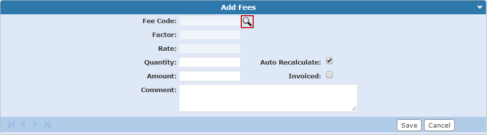 1. Click Fee Lookup next to the Fee Code field to add a fee. This opens a selection window.