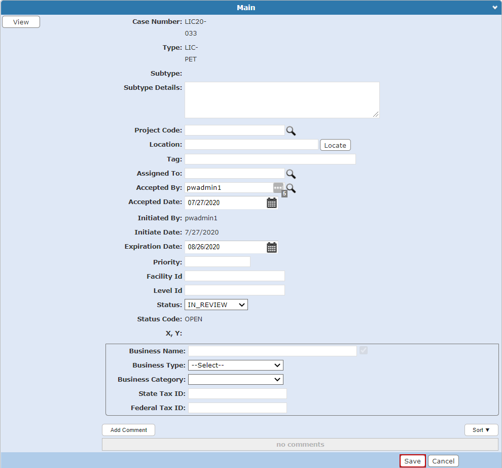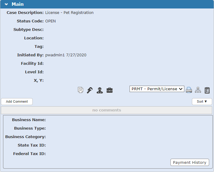 The Main panel for business license cases contains an additional section at the bottom of the panel. To edit license information for a business, complete the following: