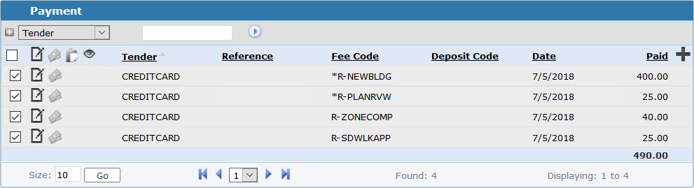 Payment is the amount of money paid. The Payment panel lists all payments made against fees to date. You may use this panel to make new payments as well as refund payments and view payments, payer information, and refunds.